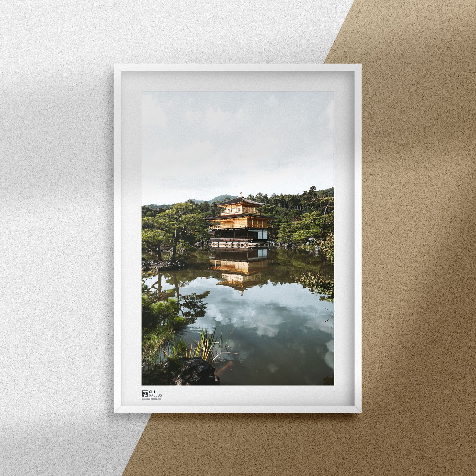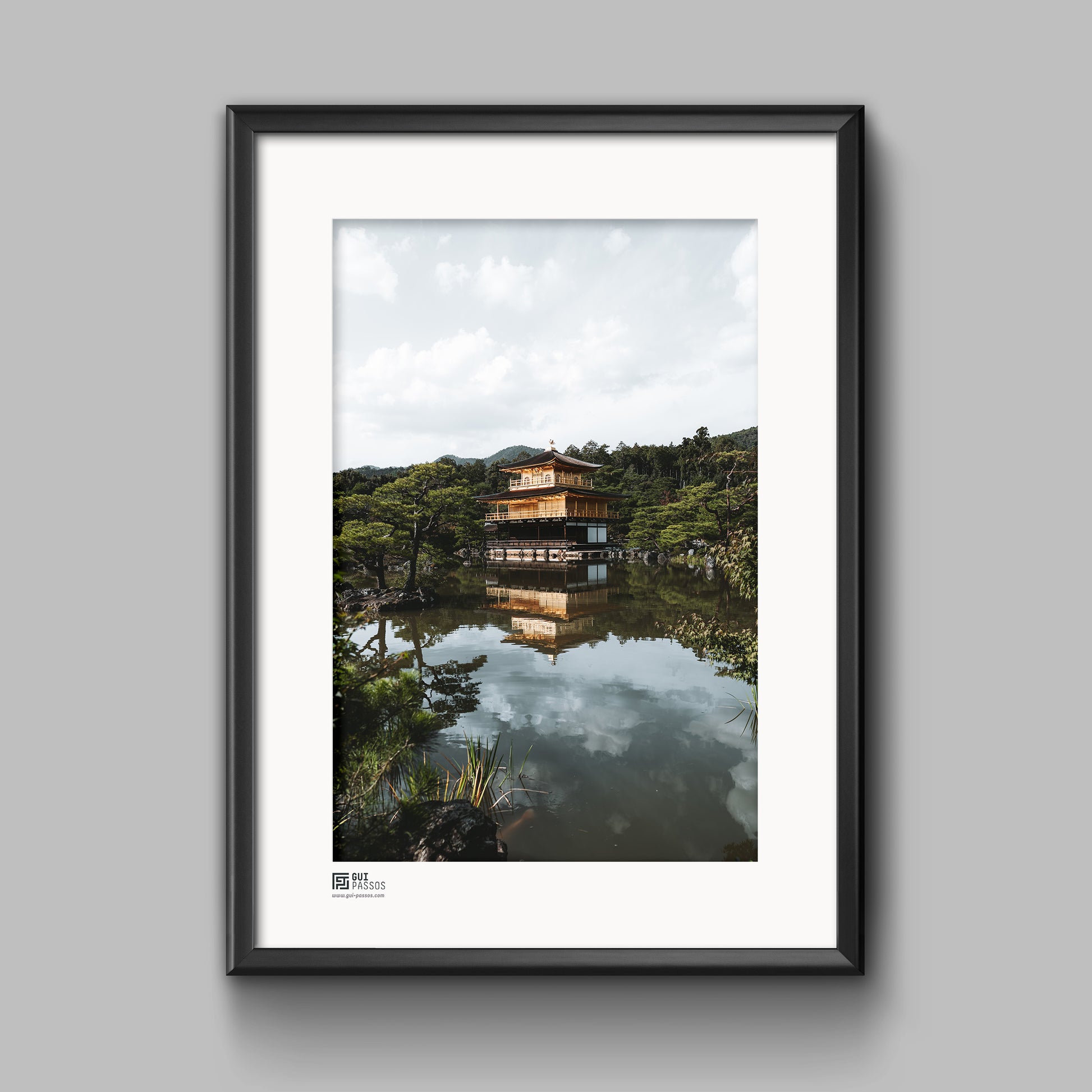 A serene view of Kinkaku-ji, the Golden Pavilion, surrounded by lush greenery and perfectly reflected in the still waters of its pond. The harmony of nature and architecture creates a peaceful scene, capturing the timeless beauty of this iconic Kyoto landmark.