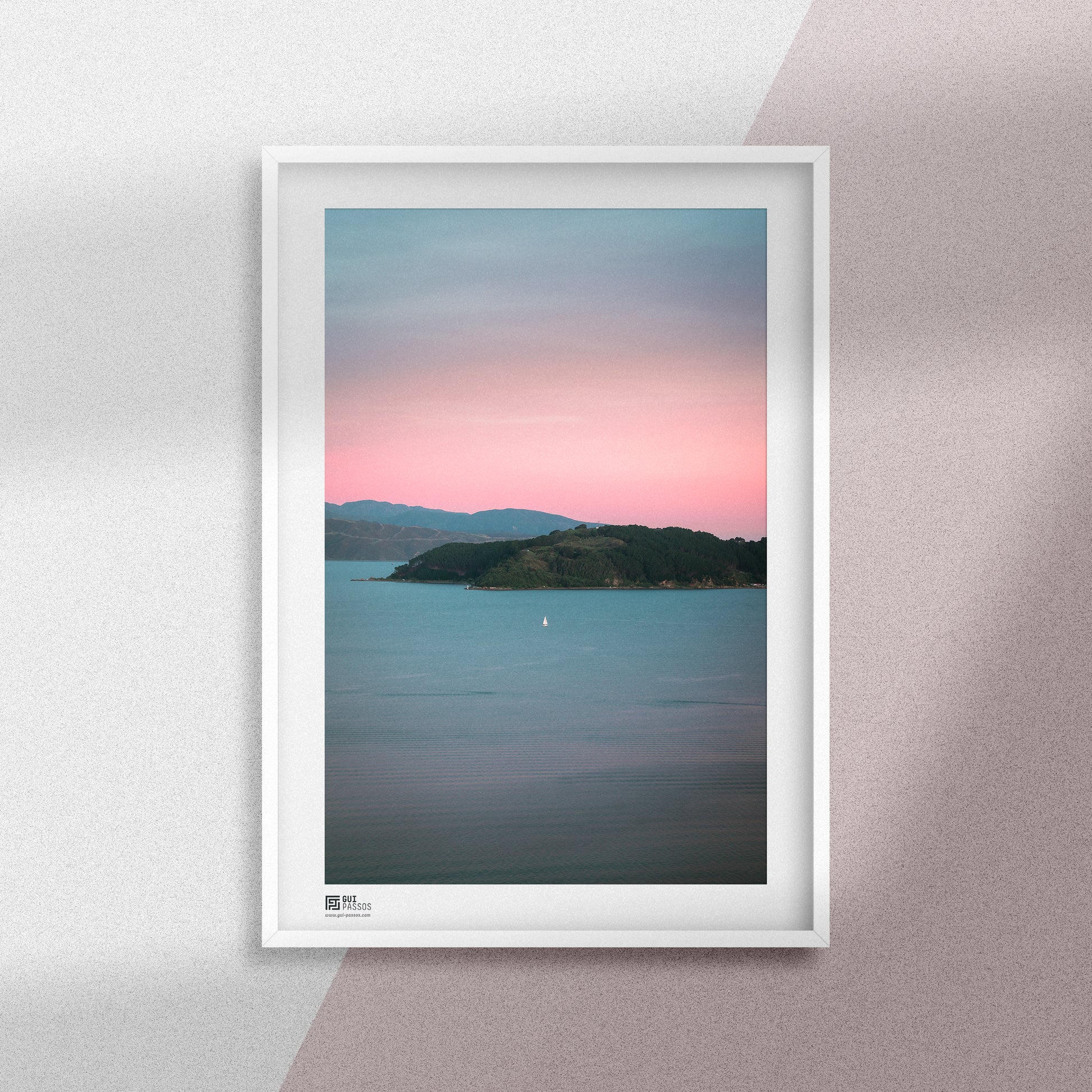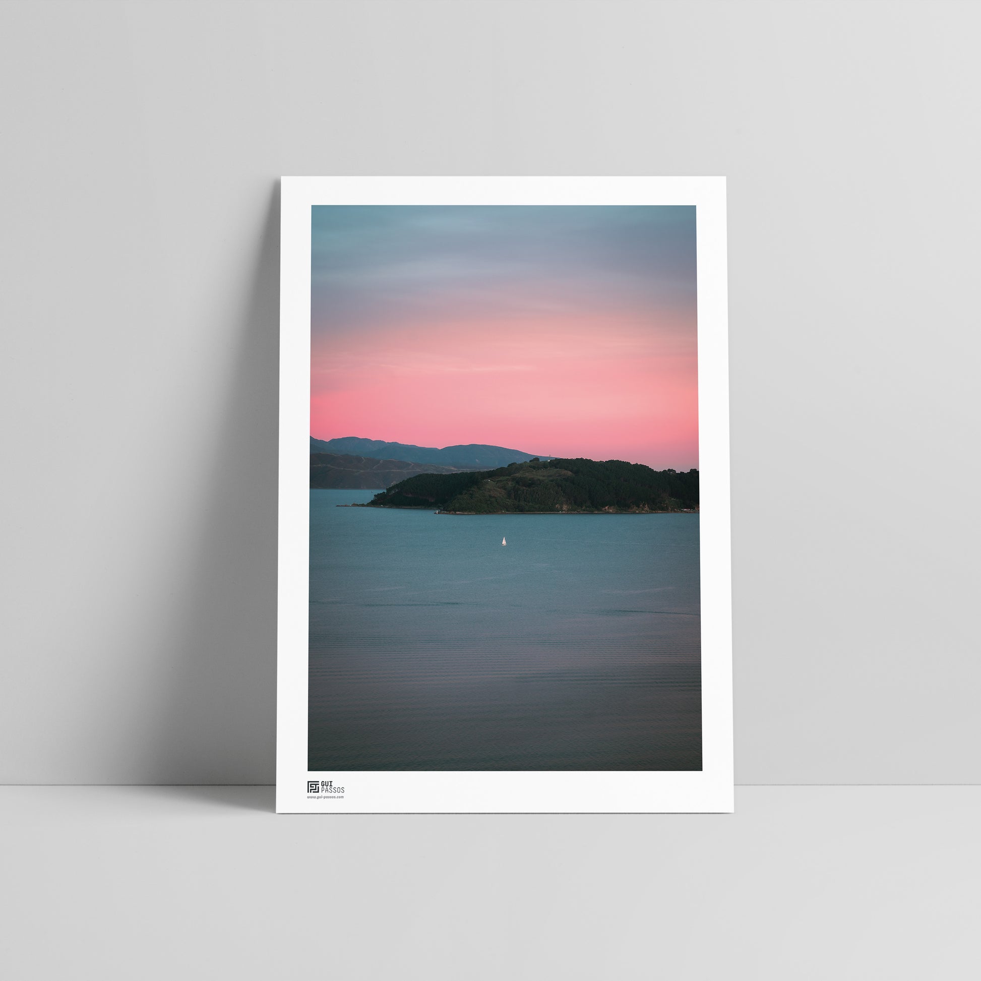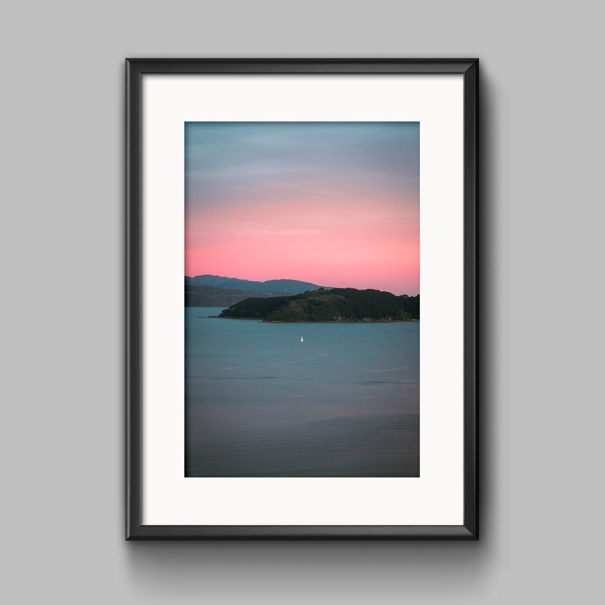 This photo captures a serene moment in Wellington Harbour during the blue hour, with the sky painted in beautiful shades of pink. A lone boat sails calmly through the still waters, creating a sense of tranquility and peace. The stunning colours of the sky and the reflection of the boat on the water create a picturesque scene that is both peaceful and breathtaking.